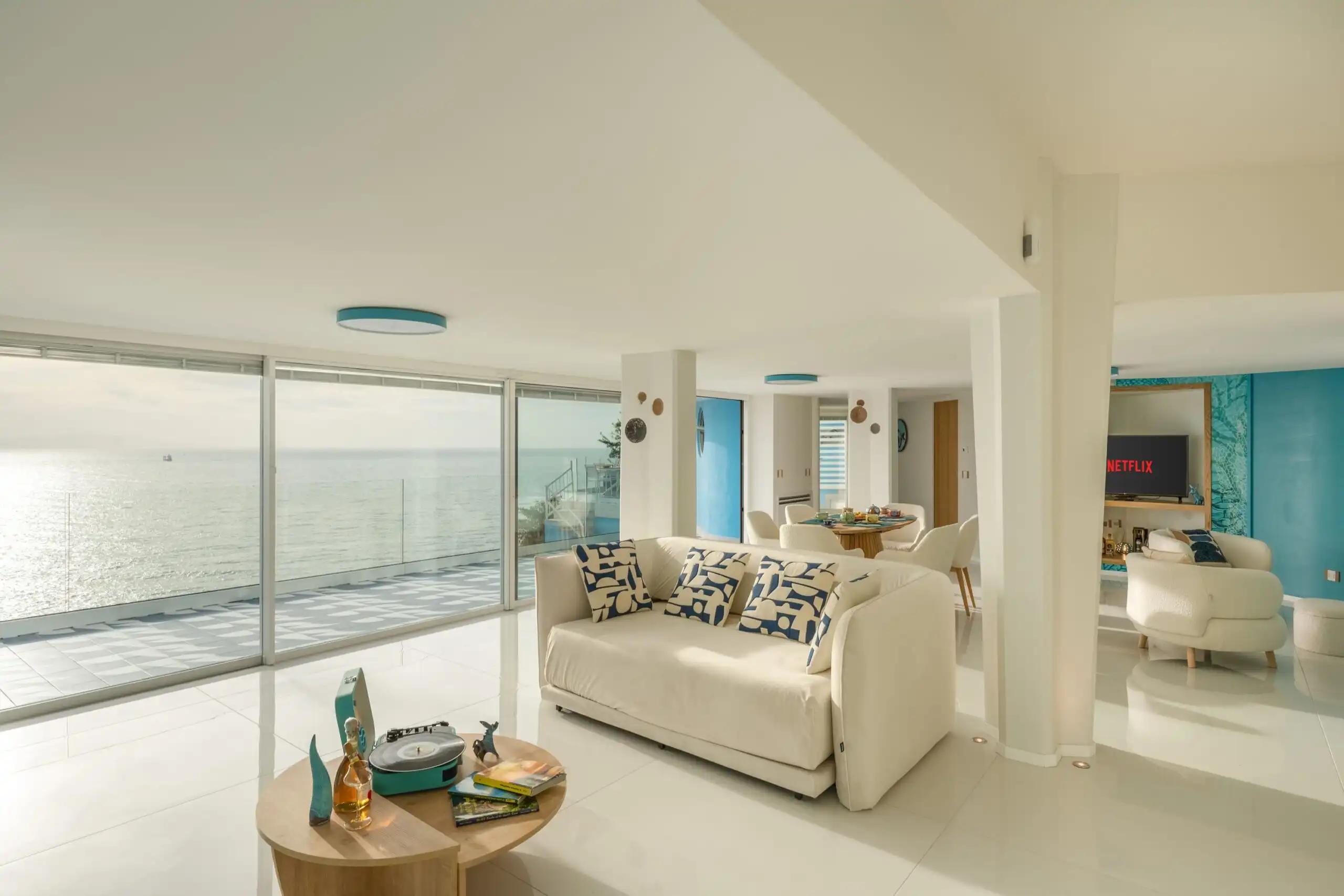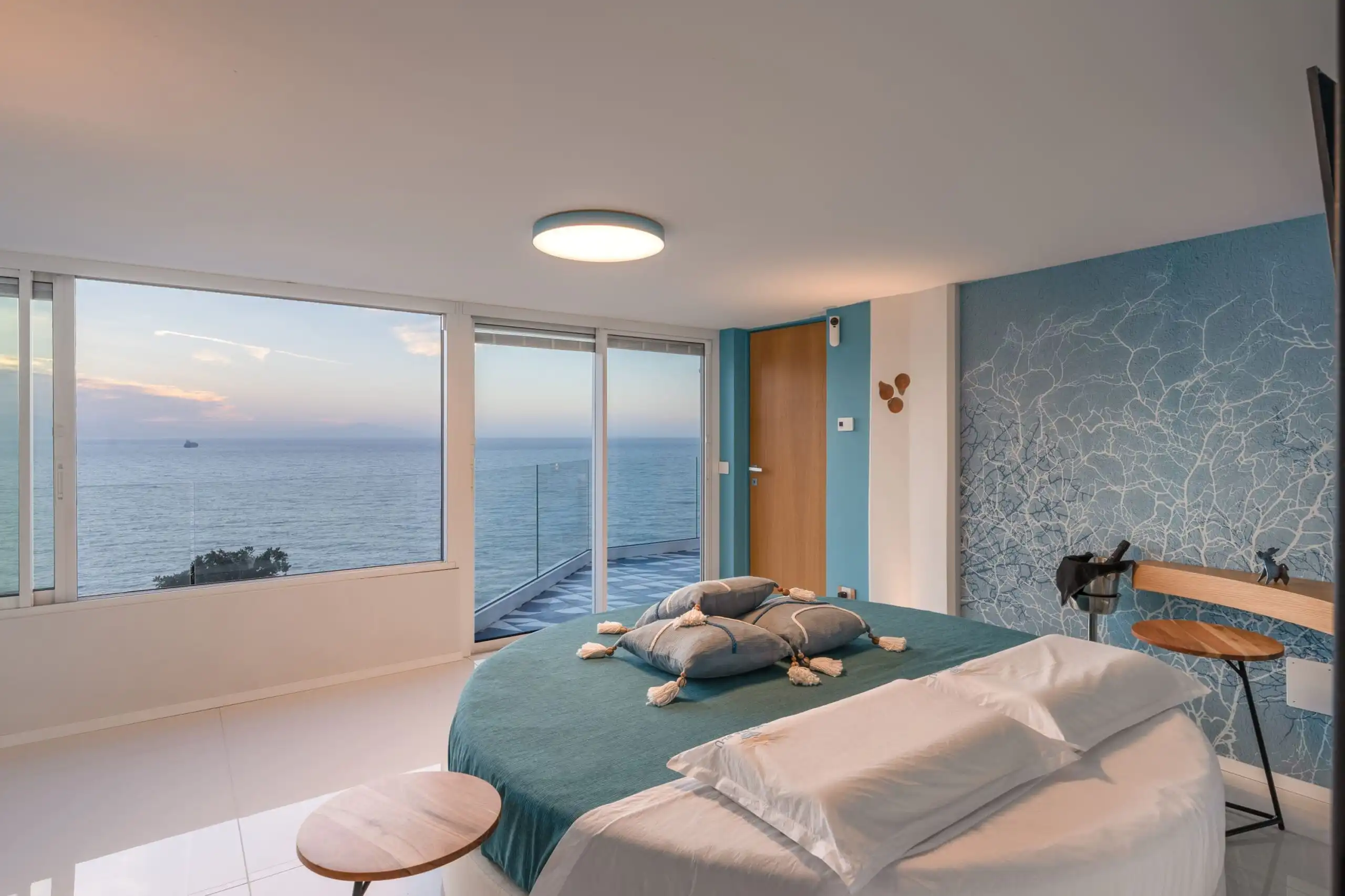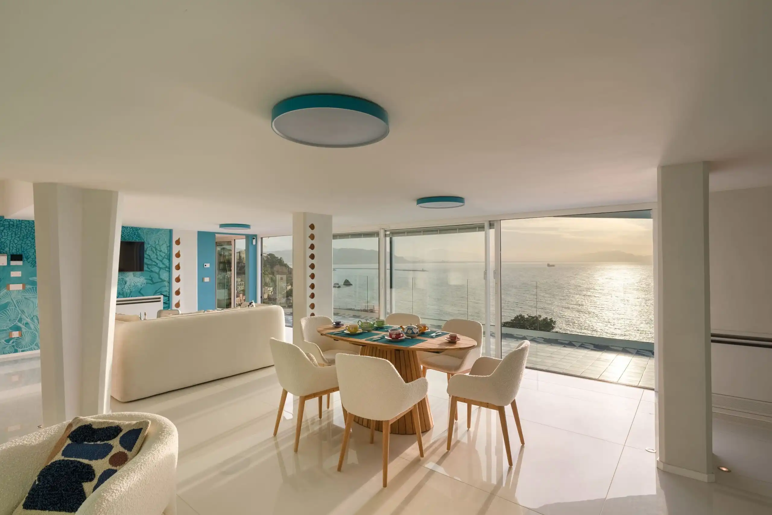 La facciata vetrata continua aperta sull’orizzonte marino rende l’interno dell’immobile esclusivo in quanto consente di vedere senza alcuna interruzione l’immensità del mare (sea wall) da ogni angolo della casa.