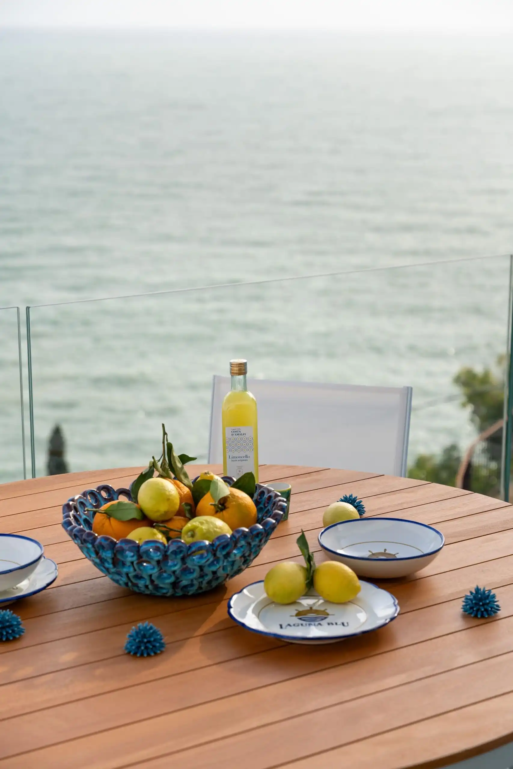 Lungo la Costiera Amalfitana in posizione dominante a picco sul mare, sorge Laguna Blu, lussuosa villa realizzata dal noto architetto Paolo Soleri.